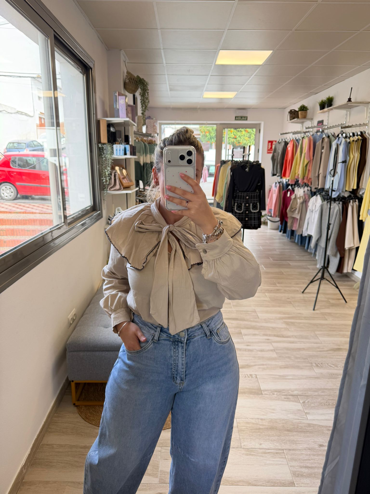 Camisa , con cuello bebe y lazada ,en el babero del cuello lleva un bordado en azul marino .