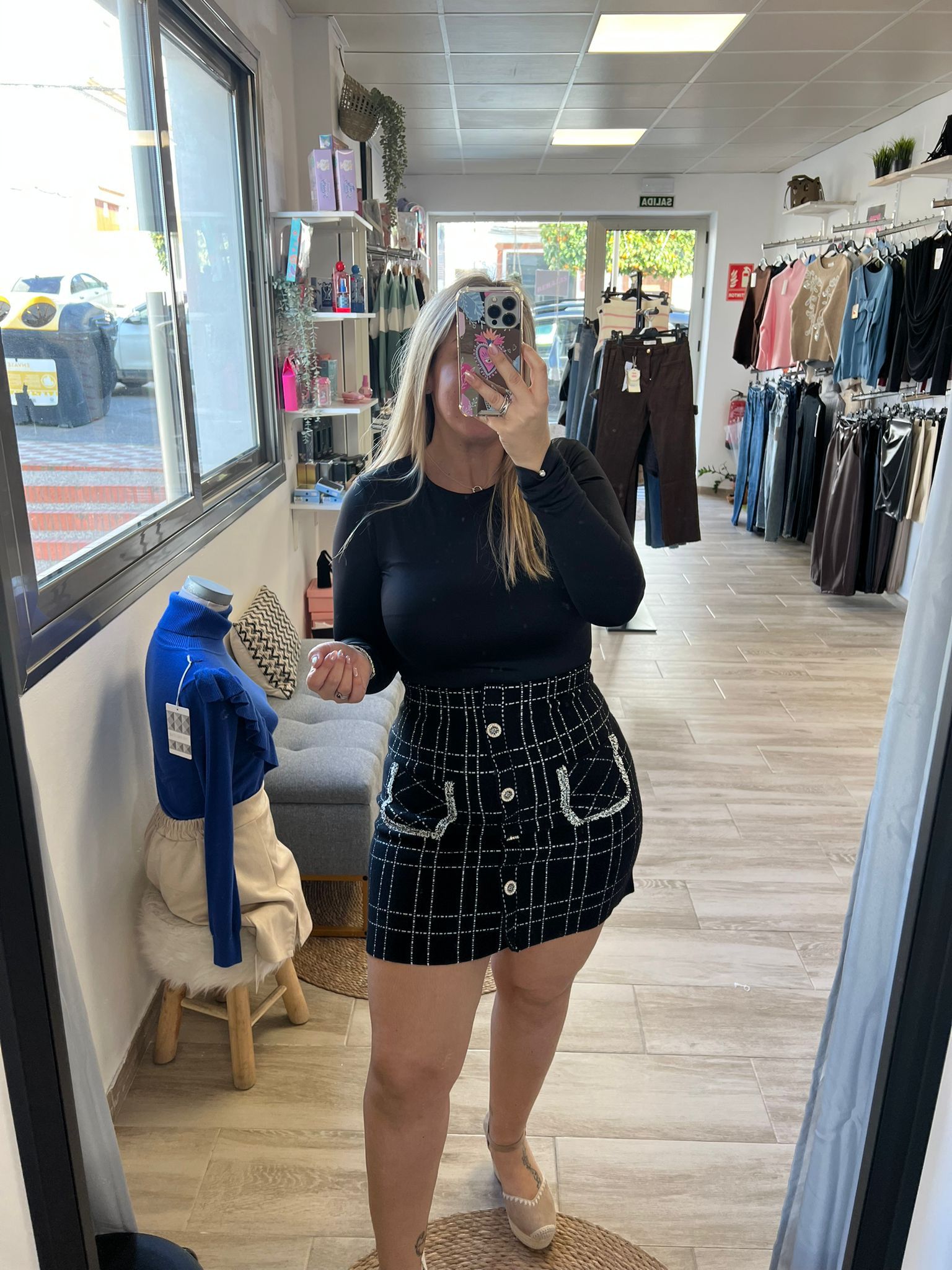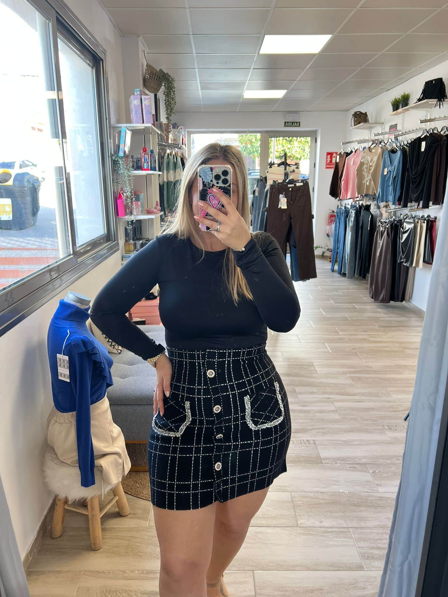 Falda en tejido punto super gustoso y bastante bueno , talla unica cintura elastica detalles de botones y bolsillos