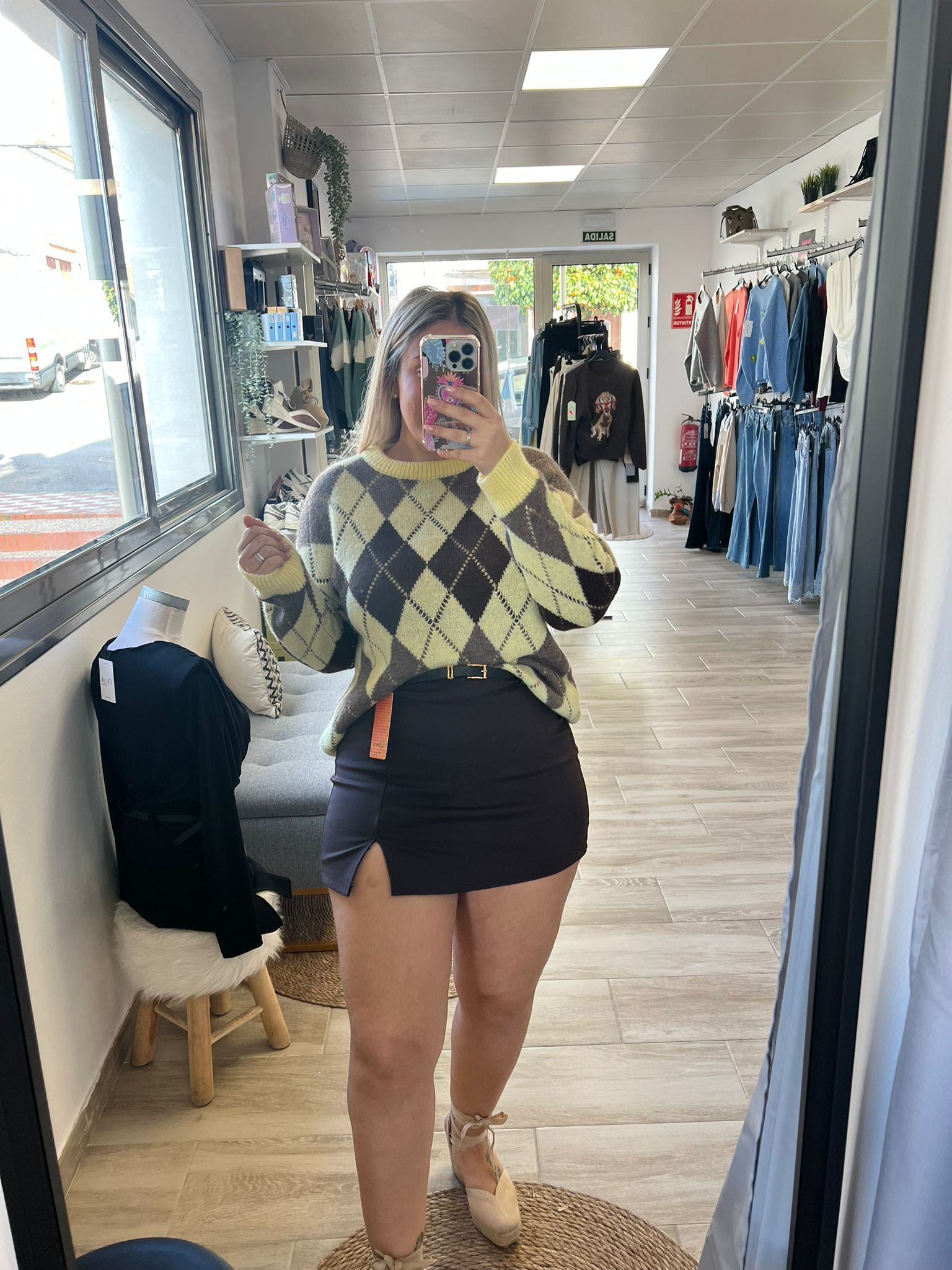 Jersey de punto en tono amarillo pastel , combinado con unos rombos en tonos camel , su tacto es increible