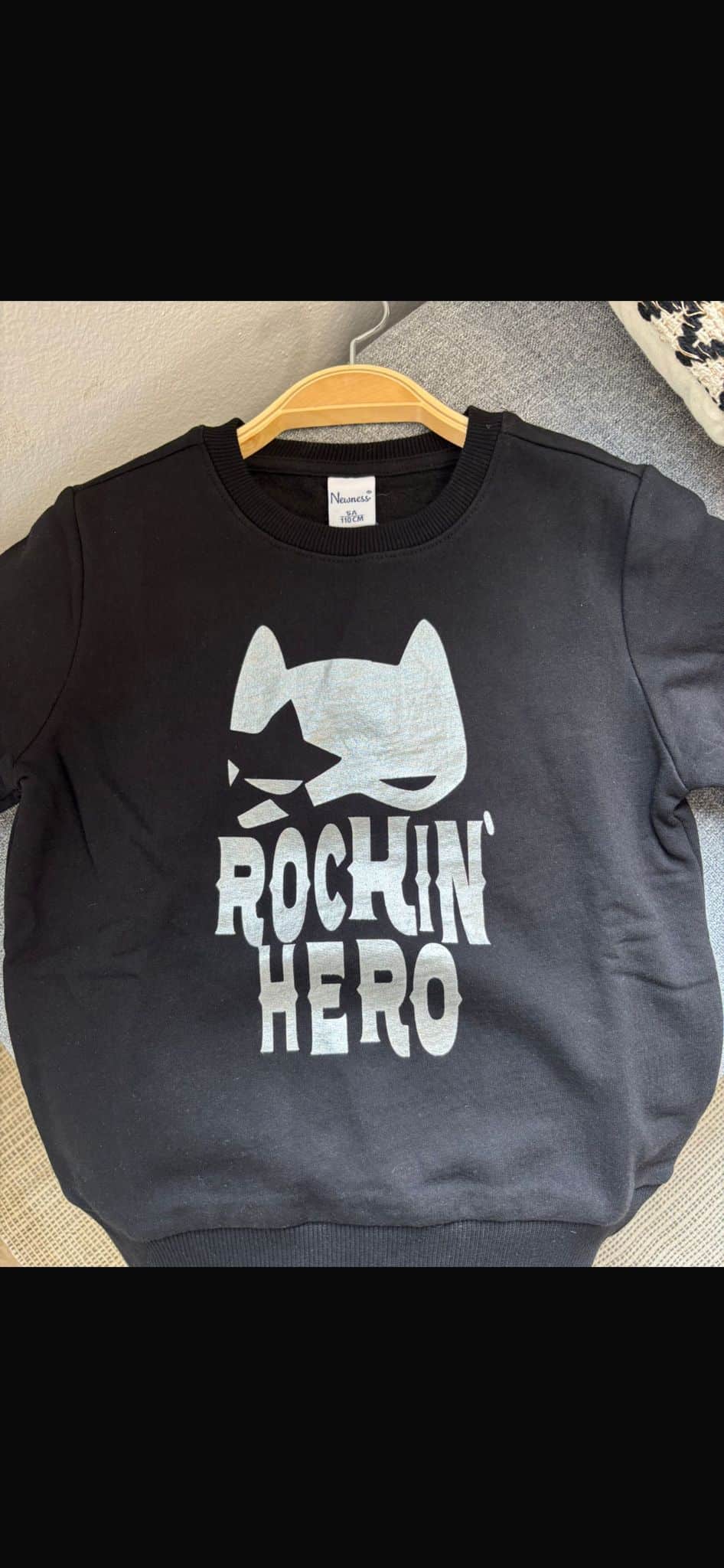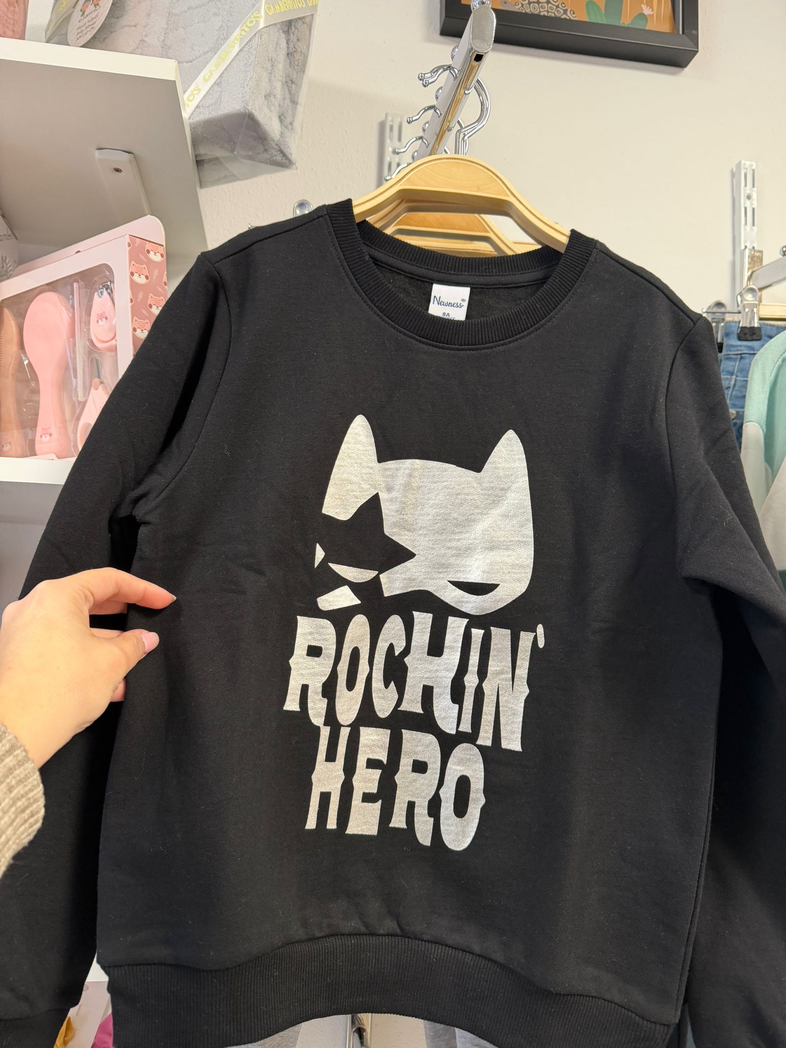 sudadera de algodon en color negro combinado con plata , cuello redondo, forrada por dentro