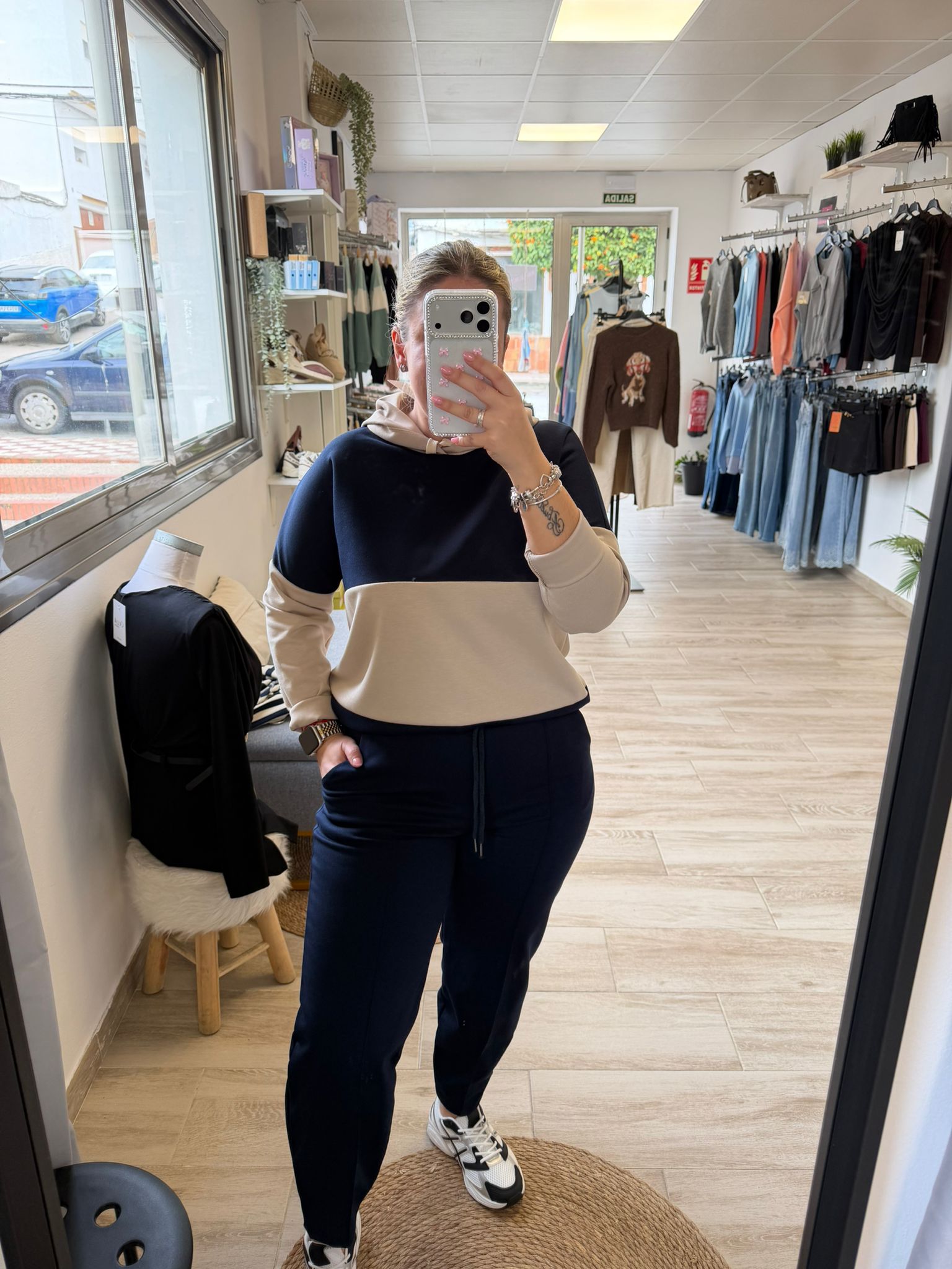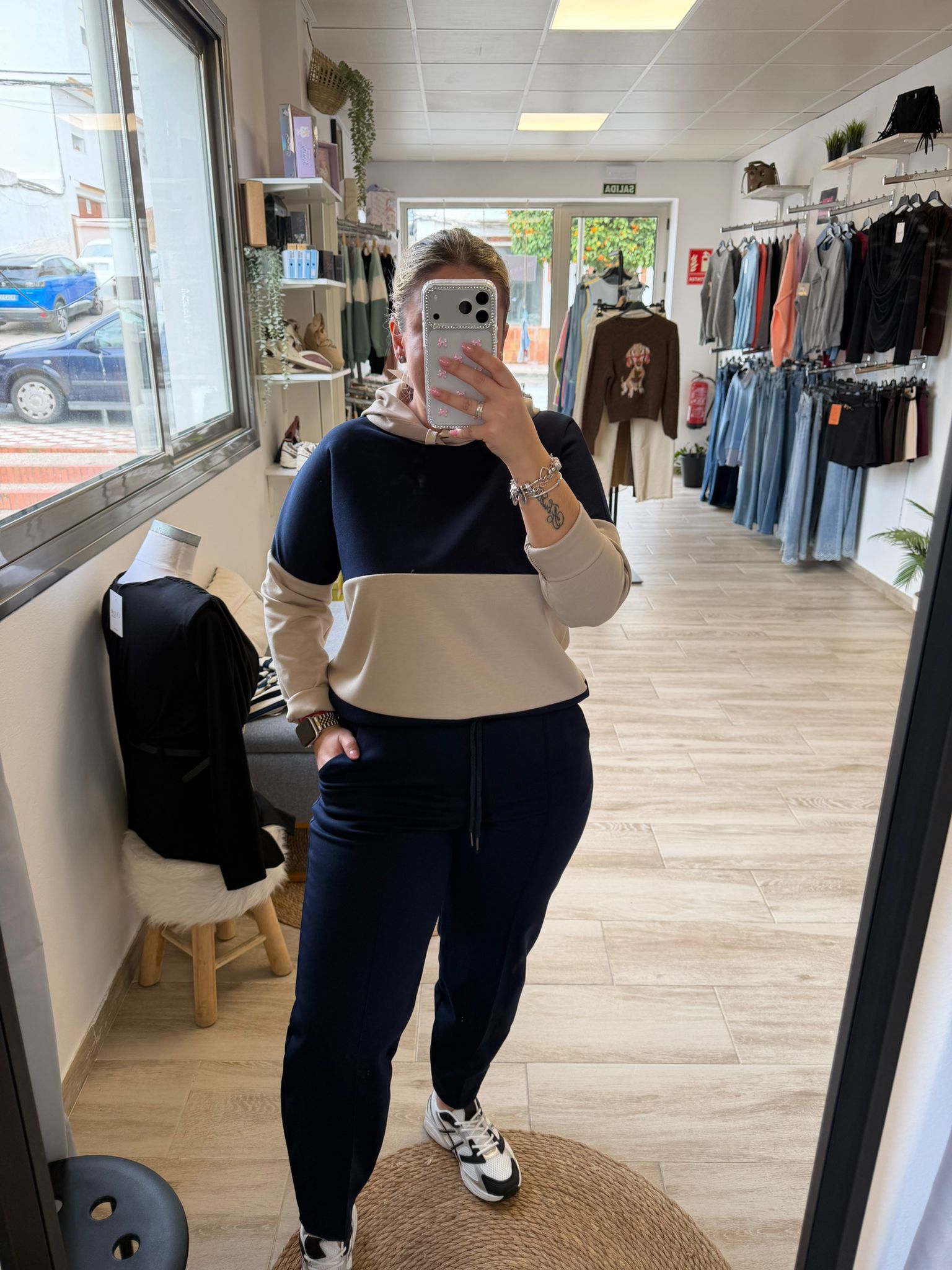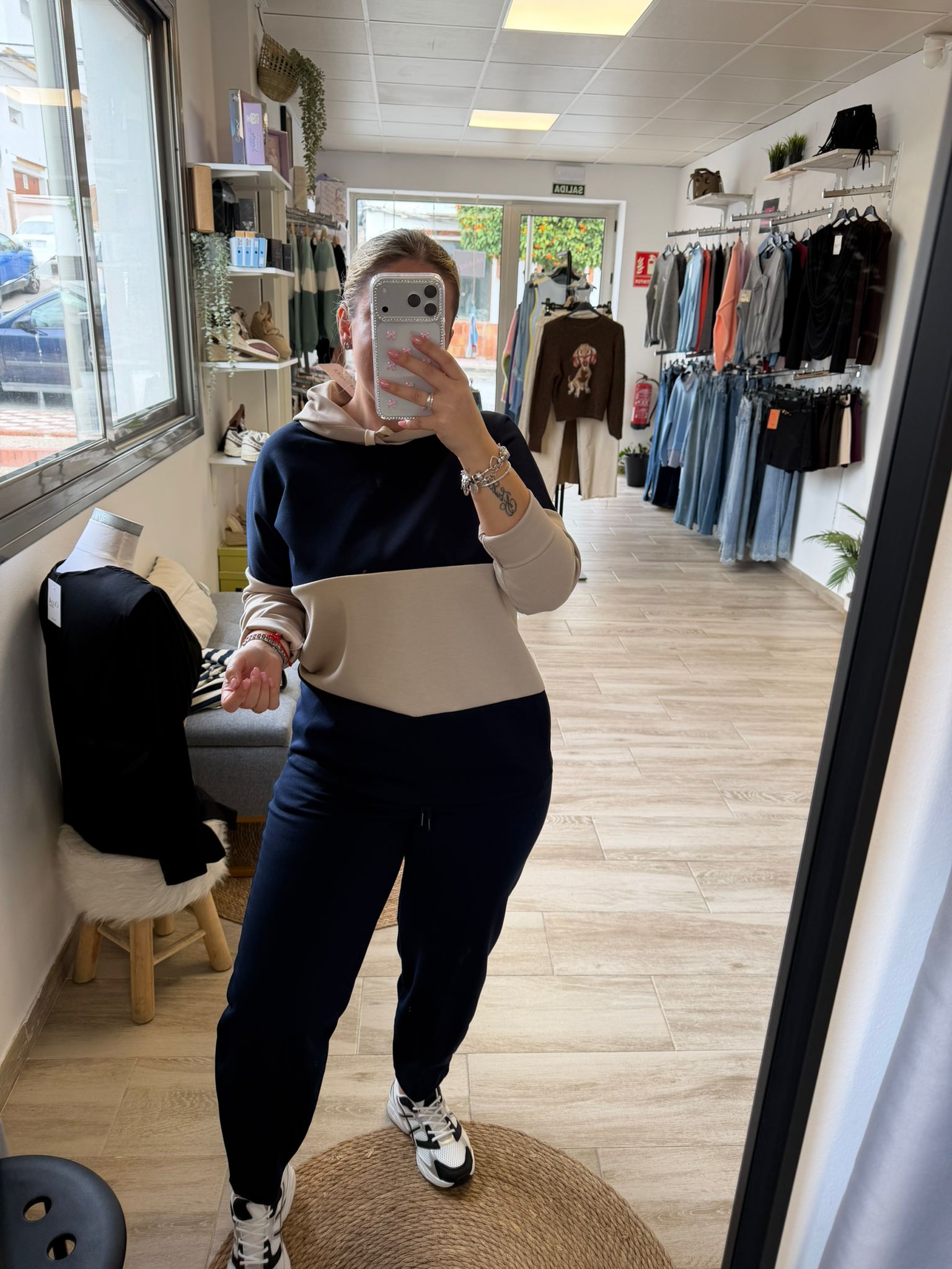 Sudadera en capa de aire , combinando dos tonos , todos llevan beig